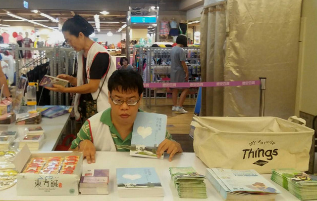 【記者于郁金/臺南報導】腦麻友陳郁盛的夢想書「愛在飛揚的音符」出版了!8月19日郁盛與媽媽都到德安百貨地下1樓義賣,購書支持者郁盛都當場親自簽名答謝,本書收入全數捐給磐石基金會「庇護莊園」築家基金。