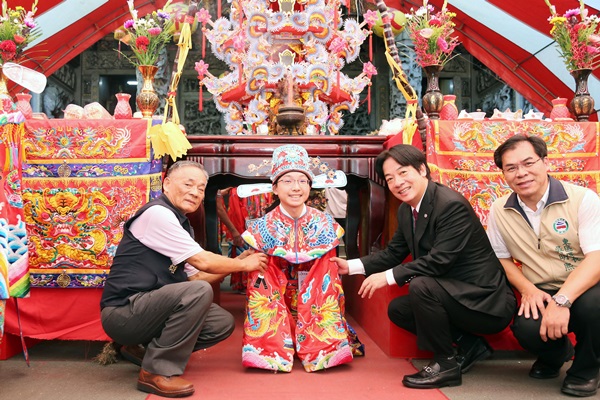 賴清德市長恭喜大家在七娘媽的保佑下,順利、平安長大,並祈求神明能夠保佑大家未來身體健康、學業進步、事業成功、家庭美滿幸福外,也感謝每一位家長的辛勞,並恭賀孩子長大了。