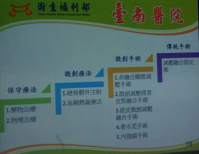 衛福部臺南醫院表示,本院有優良的復健及疼痛控制團隊,神經外科也提供顯微椎間盤切除、非融合減壓手術及減壓融合固定手術等多種脊椎神經手術治療,除扮演區域醫院及公醫長照的角色外,也能提供在地民眾更完整及多元的脊椎退化性疾病諮詢與治療。