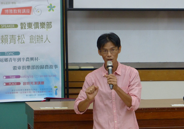 【記者于郁金/臺南報導】國立臺南大學106學年度第一學期首場博雅教育講座,於9月19日邀請穀東俱樂部創辦人賴青松蒞臨,以「從返鄉青年到半農興村──穀東俱樂部的歸農故事」為題,與南大學子分享自己回鄉耕田的心路歷程。