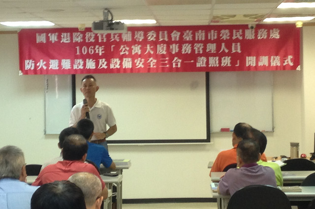 【記者于郁金/臺南報導】為鼓勵待業榮民或榮眷學習一技之長,提高技術水準,臺南市榮民服務處辦理106年職業訓練「公寓大廈事務管理員、防火避難設施及設備安全證照班」,於106年9月23日假社團法人中華民國華夏物業管理協會舉行課程開訓典禮,讓學員參加職訓的過程中,除了習得所需專業知識與技能外,透過此次參與就業訓練課程,於訓後得以順利就業。