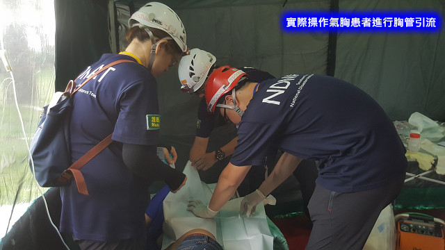 此次演習在中區醫療應變中心執行長張群岳及紀煥庭醫師等人規劃下,共有超過10家以上的DMAT參與,過程相當逼真,每隊都是全力以赴,熱血滿滿。過程中各醫療站處理約50位傷病患,各種狀況皆在主辦單位細心安排下一一呈現;安南DMAT與中港澄清醫院DMAT共同合作組成醫療站,實際操作氣胸患者進行胸管引流,呼吸衰竭患者現場進行插管,也有肩膀脫臼患者進行復位手術(圖三)以及骨折患者進行石膏固定。