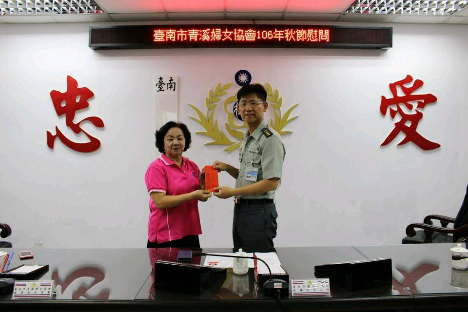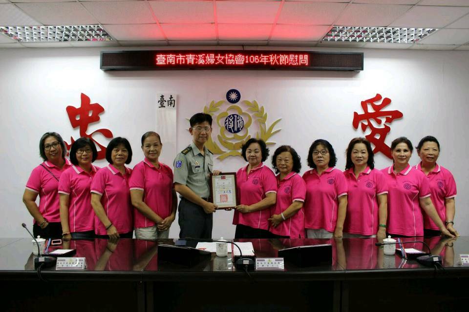【記者于郁金/臺南報導】臺南市青溪婦女協會10月2日上午在理事長方貴鳳帶領下,前往臺南市後備指揮部秋節敬軍,向官兵同仁致上最高敬意並表達關懷慰問,暸解在營環境與工作近況,為官兵同仁加油打氣。