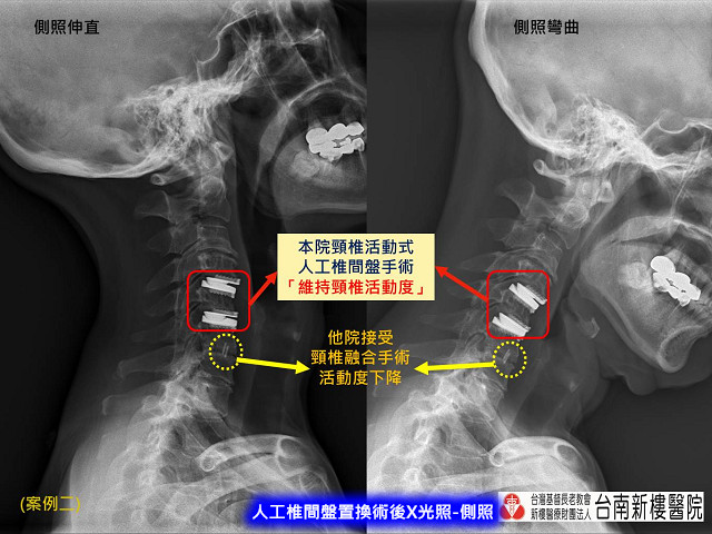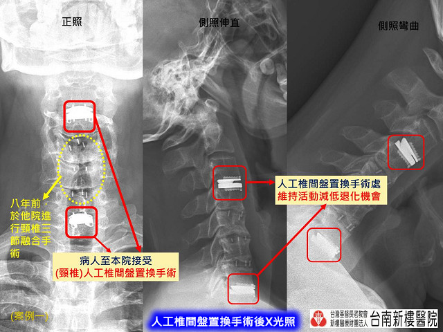 新樓醫院趙家宏醫師以臨床收治的病人為例,38歲男性,因工作需求,需長期使用電腦,於8年前至他院接受頸椎第四到第七節融合手術,約2年前開始覺得頸痛併右上肢麻痛,經復健治療後無效,來本院神經外科求診,頸椎核磁共振顯示頸椎第三四節椎間盤與頸椎第七椎胸椎第一椎間盤突出,建議做人工椎間盤置換手術(頸椎第三四節與頸椎第七節胸椎第一節),術後頸酸痛與上肢麻痛立即改善,並維持頸椎原有的活動度。