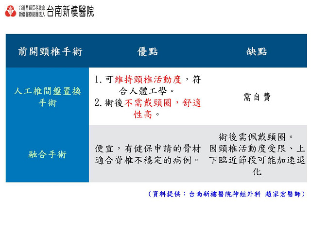 趙家宏醫師表示,長期來看,「人工椎間盤置換手術」可以大幅提高病患生活品質與滿意度,除了術後不需要戴頸圈固定,頸部可維持正常活動,最重要的是,可大幅降低頸部手術因未來鄰近節段退變需再次手術的機會;但人工椎間置換術最大的缺點是,目前健保沒有給付此項醫材;因此,在臺灣因頸椎融合手術為有健保給付的醫材,因而較被普遍使用;只是頸椎融合術術後需要戴頸圈,且依研究統計,平均約5年至10年會發生鄰近節段退變的情形,使症狀復發,病人生活品質降低,而頸椎融合節段越多發生率越高。(圖/臺南新樓醫院提供)