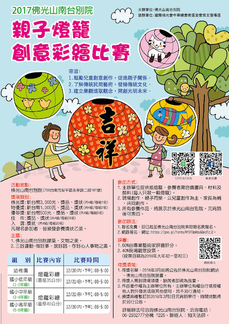 佛光山南台別院表示,為推廣三好運動並呈現燈籠文化藝術之美,廣邀親子攜手彩繪燈籠揮別2017、迎接新的一年到來,特別舉辦「親子燈籠創意彩繪比賽」,即日起開放報名,有意參加者可至南台別院索取報名表現場報名,或上網址:https://goo.gl/forms/Rf3T9p8duGGkdTzj2 報名。
