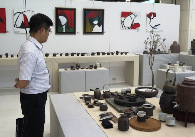 會場共展出近百件的陶藝作品,首先映入眼簾的為全方位藝術家-楊子雲的作品,其中又以「翠玉釉燒」為代表作,略為歪斜的茶碗造型,黃綠的色澤充滿大自然氣息,而場邊吊掛的畫作及書法皆出自於楊子雲之手,更增添不少詩意;陶藝大師-陳金旺採用台中大肚山紅土作為釉料,藉由不斷地挑戰窯燒極限,現場展出系列作品,讓傳統漆器變得很現代,為陶藝界吹來藝術風;由一位雕刻陶藝家-楊達常和一位生態畫家-粘素真兩人攜手創立南屯陶畫館,夫妻倆人共同研發古代柴燒窯,伉儷聯手展現絕佳陶藝;而以「設計為魂,工藝為骨」的上作美器,作品榮獲多項工藝設計競賽獎項,每件作品皆遵循人體工學,關照每一處細節,打造出茶具的黃金比例。