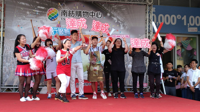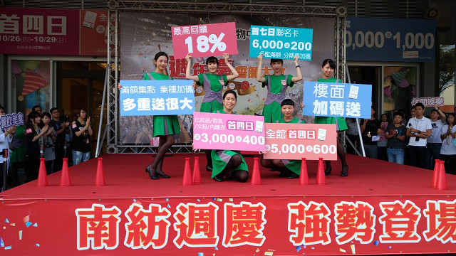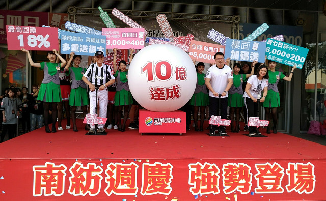 南部各大百貨公司週年慶活動陸續登場,價格戰競爭日趨白熱化,24日下午13時30分,南紡購物中心於中華東路大門口,舉辦週年慶誓師大會,全館總動員分別化身成運動員、啦啦隊及閃亮舞者,帶來一連串精采勁歌熱舞炒熱現場氣氛,緊接著購物中心總經理廖孟省、營運部部經理楊鈵彥、營運部副部經理李妍嫻等人,在眾人歡呼聲走進舞台中央,齊心灌飽一顆「10億達成」大氣球,讓整場活動HIGH到最高點。