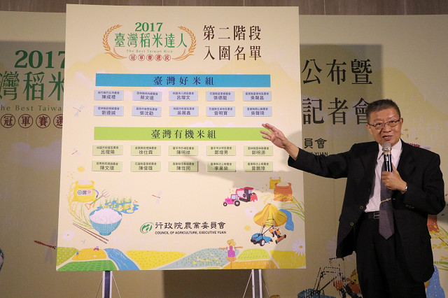 【記者于郁金/臺南報導】行政院農業委員會農糧署公布「2017臺灣稻米達人冠軍賽」入圍決賽名單,本年共有來自全國63個鄉鎮超過500位農友參賽,經鄉鎮賽競賽後,由78位農友獲角逐臺灣稻米達人冠軍賽全國賽資格,經第一階段評選,在評審團代表林玫欣及藍文彬委員共同見證下,由農糧署陳署長建斌宣布「臺灣好米組」及「臺灣有機米組」各10個取得入圍決賽資格名單。
