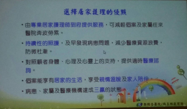 藉由居家護理深入社區,走入家庭,定期提供居家管路更換、照顧者照護指導與心理支持;避免因擔心、害怕家人老化衰弱,需依賴管路維持正常的生理機能無法照顧,而必須忍痛將家人送機構式照護,讓失能、衰弱的民眾也能安心在家享受家庭溫暖,實現在地老化,老有所終的理想。