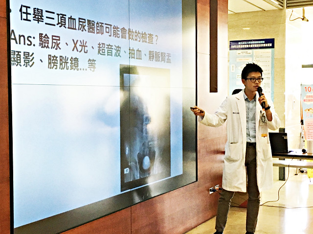 活動在門診大樓1樓大廳舉行,成大醫院泌尿部胡哲源醫師解說血尿的原因和診斷方式。胡哲源醫師說明,節食、發炎、激烈運動、癌症等都有可能造成血尿。