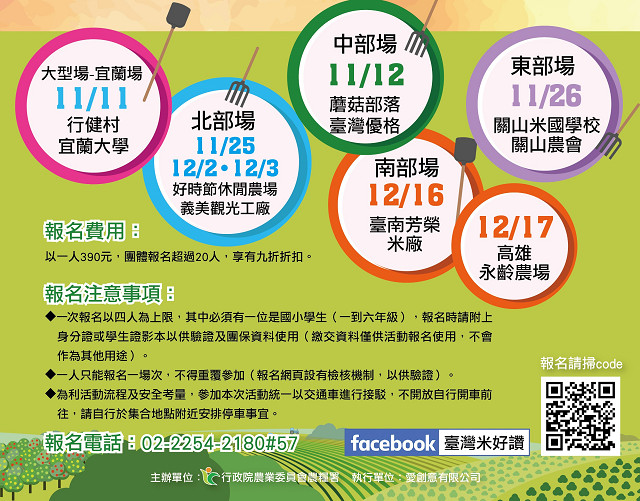 農糧署於全臺北、中、南、東舉辦「臺灣米達人尋寶趣—農業體驗FUN樂趣」體驗營8場次,分別是11月11日宜蘭場(行健村-宜蘭大學)、11月25日及12月2至3日北部場(好時節休閒農場-義美觀光工廠)、11月12日中部場(蘑菇部落-臺灣優格)、11月26日東部場(關山米國學校-關山農會)、12月16日南部場(臺南芳榮米廠)、12月17日南部場(高雄永齡農場)。