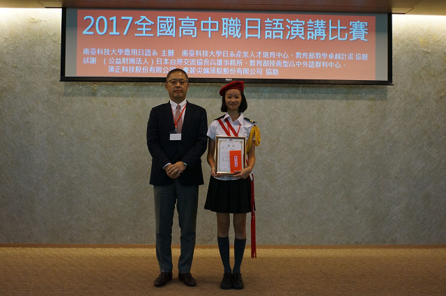 【記者于郁金/臺南報導】南臺科技大學主辦「2017全國高中職日語演講比賽」日前於南臺科技大學國際會議廳進行決賽,15位參加決賽的同學都是經過初賽激烈競爭後,脫穎而出的優秀代表,表現都非常優異,以流利的日語,外加豐富的表情,展現出語言天份,比賽結果由樹德家商許茜雯同學所演講「無心的一句話」,榮獲本屆比賽冠軍。