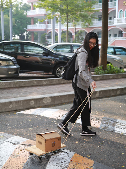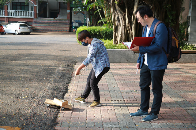 運送過程還會要求學生全程拍攝,透過鏡頭闡述設計概念與設計特點,也能觀察設計缺失與改進方向;同時訓練同學口條與說服老闆或消費者,能夠採用與信服該設計,的確是美觀與實用兼具,過程中,有同學故意將板車打翻,證明自己設計的確堪用。