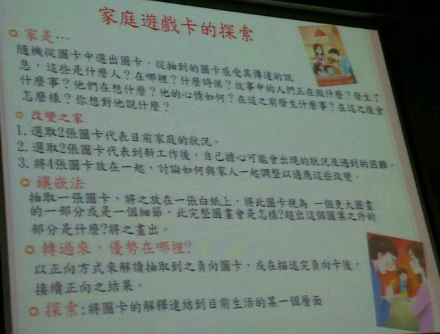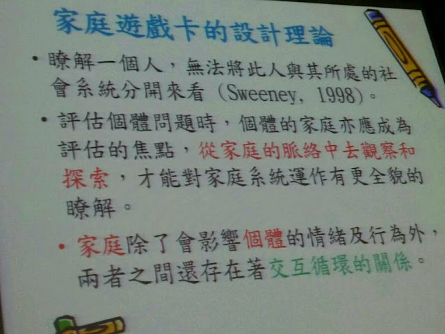 諮商與輔導學系吳麗雲老師團隊結合桌遊與輔導功能,設計情境圖卡,此圖卡結合情境遊戲卡和家庭系統評估的優勢,可運用於個別、團體、親子與家庭諮商與輔導上,並獲中華民國專利(新型第M540359號)。遊戲卡卡片共40張,包含37張各種家庭情境圖卡及3張空白圖卡(使用者可自行創作家庭情境),透過圖卡的情境畫面,喚起大腦與此情境有關的記憶,讓教師可透過此具像的圖卡,開啟與學生對話的話題,並且對學生所處的家庭生活、家庭互動和家庭角色能有所瞭解,並可運用在與學生家長進行親職教育及父母諮詢之媒材。