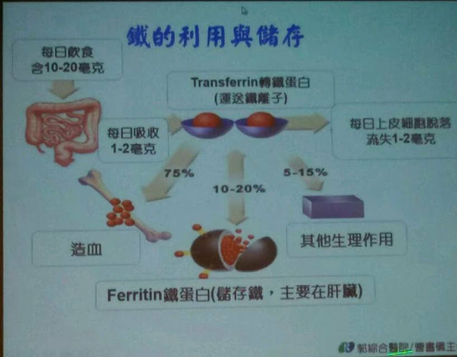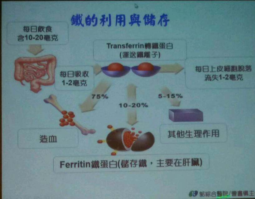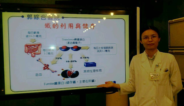 曹書儀主任說明,貧血的定義為男性血色素低於13g/dL,女性血色素低於12g/dL,貧血的症狀包括疲倦,頭暈目眩,喘(尤其活動增加時),心跳加快,低血壓,甚至休克,超過半數的貧血與缺鐵有關;檢驗體內的鐵含量會測三個數值,分別是鐵蛋白(Ferritin),鐵離子(Iron),總鐵結合量(TIBC);利用鐵離子(Iron)除以總鐵結合量(TIBC)算出轉鐵蛋白飽和度(Transferrin saturation),缺鐵的定義為鐵蛋白(Ferritin)小於15ug/L(或12ug/L),轉鐵蛋白飽和度小於18%(或15%);當符合貧血與缺鐵的定義,就稱為缺鐵性貧血。