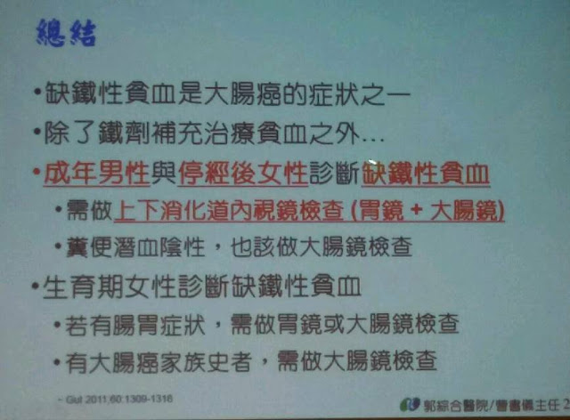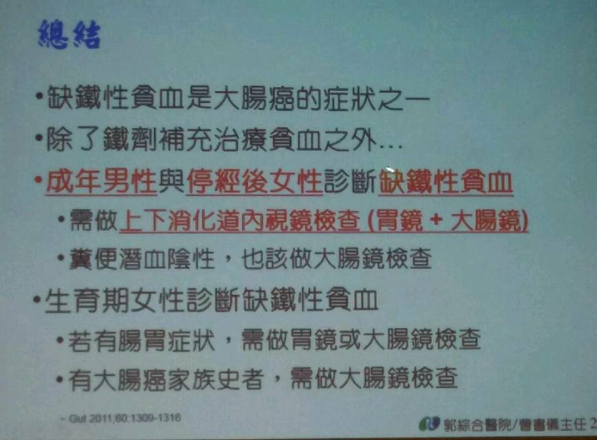 曹書儀提醒,缺鐵性貧血是大腸癌的症狀之一,除了鐵劑補充治療貧血之外,還需要檢查鐵質流失的原因;成年男性與停經後女性診斷缺鐵性貧血,需做上下消化道內視鏡檢查(胃鏡+大腸鏡),即使糞便潛血陰性,也該做內視鏡檢查;生育期女性診斷缺鐵性貧血,大部分是因為月經的血液流失過多,但若有腸胃症狀,需做胃鏡或大腸鏡檢查;若有大腸癌家族史者,需做大腸鏡檢查。