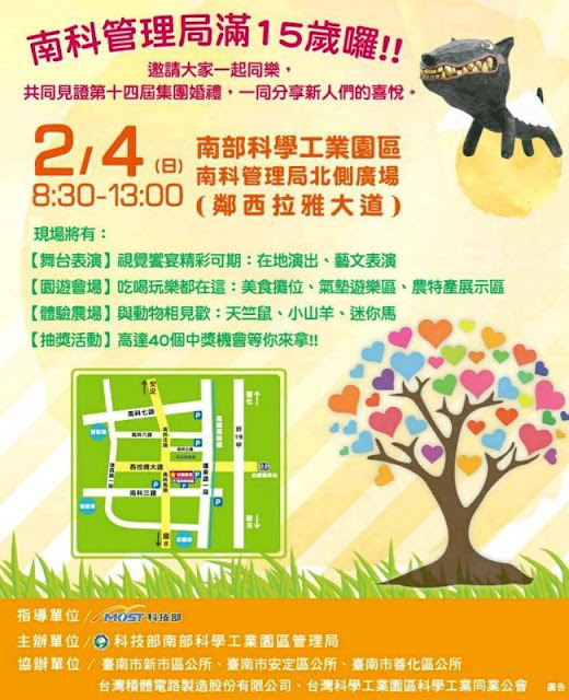 【記者于郁金/臺南報導】科技部南科管理局將於107年2月4日週日上午8時30分在該局北側廣場舉辦15週年局慶暨14屆集團婚禮,邀請大家一起來提前感受過年熱鬧氛圍並為新人獻上溫暖的祝福。