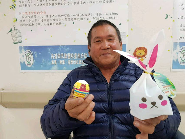 【記者于郁金/臺南報導】力行用愛守護每個生命的臺南市天主教生命關懷協會,日前由法籍畢神父帶領修女、志工計十餘人,來到高雄榮總臺南分院探視關懷醫病,並贈送象徵新生命、重生的復活彩蛋給醫護、病人與家屬,個個樂開懷。