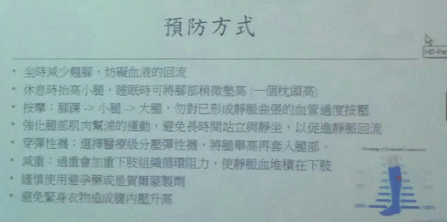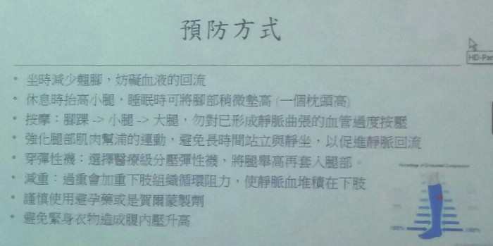 侯醫師建議抬腿與腿部舒緩運動,以促進靜脈的血液回流,穿壓力指數較高的彈性襪;工作30-60分鐘抬腿10-15分鐘。再配合口服類黃酮苷類藥物diosmin 以及外用藥膏局部塗抹;大約不到2個星期時間,病患腿部沉重感明顯改善,腫脹導致疼痛的頻率減少很多,不再需要止痛藥或打針止痛。侯盈仲醫師提醒,不可直接按摩靜脈曲張處或靜脈瘤,否則提高血栓剝離風險,嚴重會產生肺栓塞而致命。