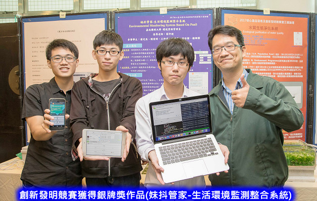 4、銀牌獎:嘉南藥理大學,參賽教師葉仲超;參賽學生蔡定辰、劉家瑋、王坤盛、許峻豪、謝安傑、楊語傑,得獎作品「妹抖管家-生活環境監測整合系統」。