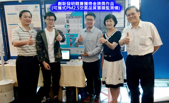 1、金牌獎:嘉南藥理大學,參賽教師許菁珊、梁治國(東專)、盧明俊;參賽學生劉韋廷、郭俊賢,得獎作品「可攜式PM2.5空氣品質雲端監測儀」。