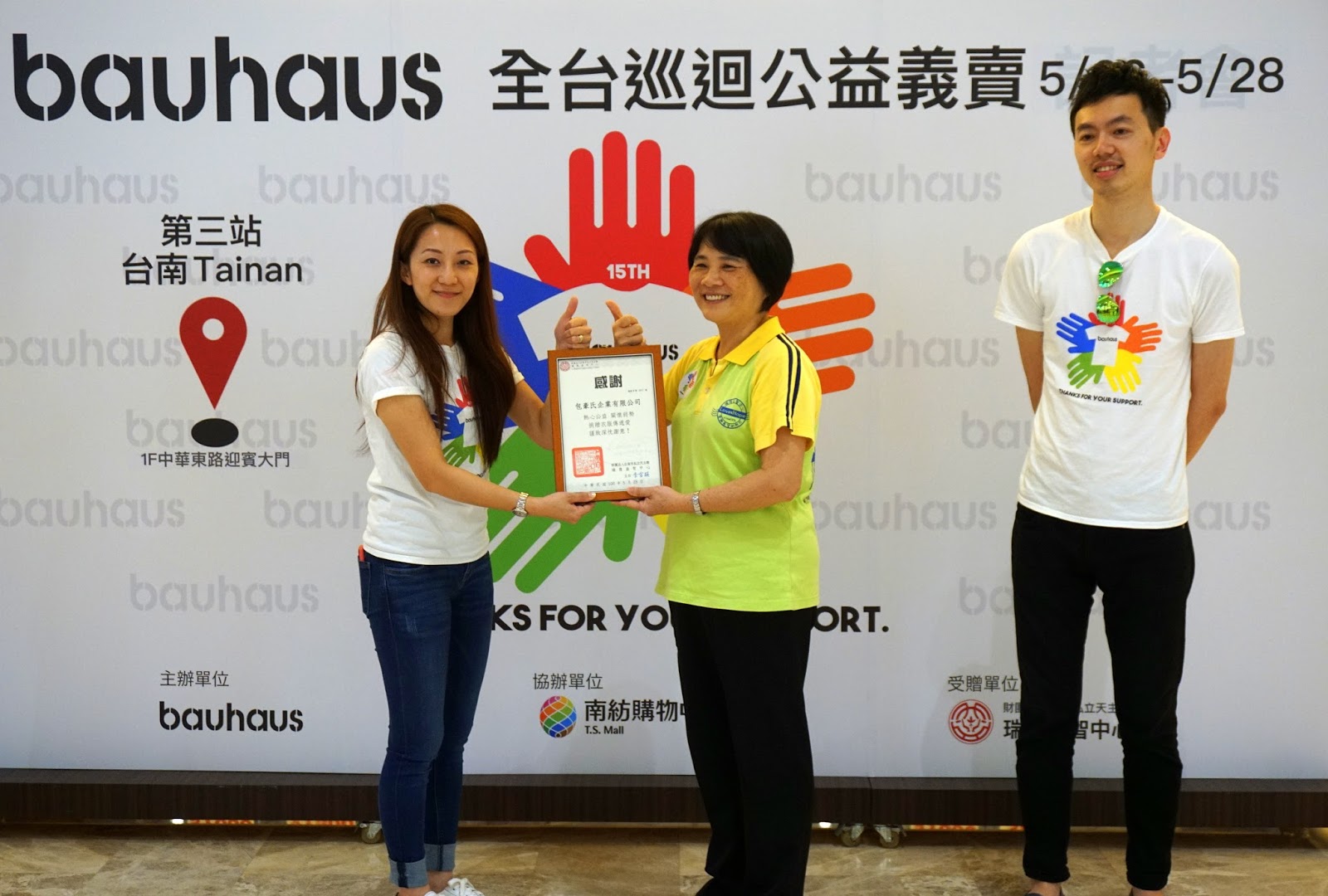 包豪氏 Bauhaus 集團28日晚在南紡購物中心1樓迎賓廣場,舉辦bauhaus全台巡迴公益義賣的捐贈儀式,由包豪氏集團行銷主管Greta、南紡購物中心營運部副部經理李妍嫻,在熱心公益的江信智律師見證下,將象徵捐贈善款266,600元的大型支票板,交給瑞復益智中心主任李雪瑛,李雪瑛回贈感謝狀予兩企業,表達感謝之意,一連3天,買衣送愛助弱勢活動完滿成功。