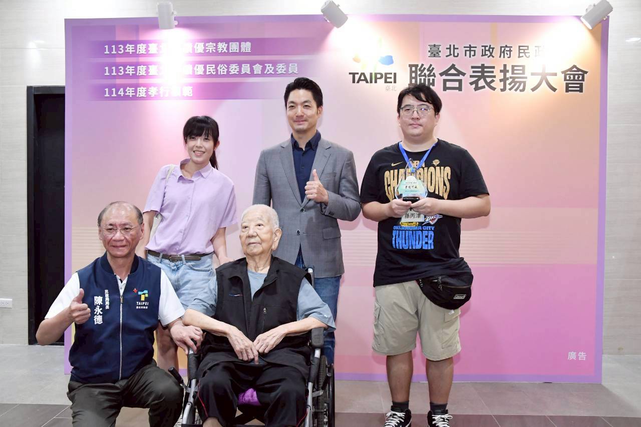 蔣萬安接著說,另一方面,民俗委員會也扮演很重要的一股力量,包括許多清寒學子的獎助學金,其實不要看這小小的一個獎助學金,其實對於這些孩子,獎助學金不止幫他們解決生活、生計上面的問題,對他來說也是一種鼓勵,讓他能夠持續、堅持在求學的路上努力往前走。同時,民俗委員會也給予很多臺北市獨居長者相關的物資,這些都讓我們感受到非常溫暖,他常說「政府資源有限、民間力量無窮」,臺北市政府除非常感謝在座許多宮廟、各個團體、民俗委員會,也非常欽佩兩位獲獎的「孝行模範」─孫丙津先生與李惠美女士,他們用實際的行動來展現對長輩的「孝」。我們常講,樹欲靜而風不止、子欲養而親不待。感謝兩位孝行模範樹立典範、發揮影響力。透過今天的表揚,也希望有越來越多市民朋友可以感受到民間的溫暖、民間的力量。