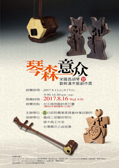 【記者于郁金/臺北報導】為推廣林產物多元利用,行政院農業委員會林業試驗所特別邀請臺灣二胡專業製琴師宋國昌、木材工藝藝術家劉邦漢,於106年8月11日(五)至9月17日(日),假臺北植物園欽差行臺辦理「琴森意众-宋國昌胡琴暨劉邦漢木藝創作展」,並於8月16日(三)上午舉辦開幕典禮。