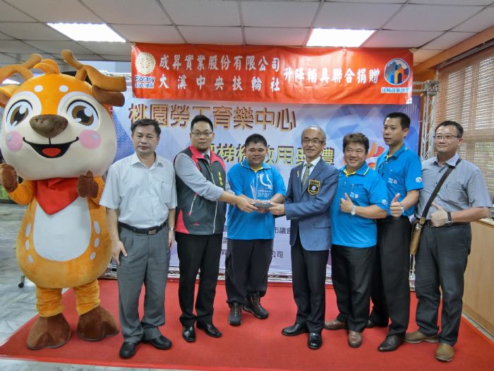 勞動局長王安邦表示,感謝市議員陳治文為照顧身障勞工朋友,大力奔走促成一向熱心公益的成昇實業股份有限公司及大溪中央扶輪社合資共同捐贈桃園勞工育樂中心爬梯機1座,該公司係從事無障礙輔具製造的優良企業,目前已捐贈了 6台「無障礙移動式輪椅平台」 設置於桃園北區老人文康中心及市內5所學校,幫助行動不便的朋友上下舞台使用,現在又再次展現其熱心公益的精神捐贈爬梯機,讓老舊的桃園勞工育樂中心,在無障礙設施的改善向前邁進一大步。