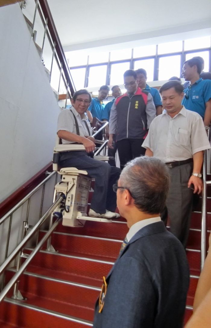 【本報訊】桃園市大溪區成昇實業股份有限公司,熱心公益,體諒行動不便勞工朋友上下樓梯困擾,捐贈轉彎式樓梯升降椅(爬梯機)1座安置於桃園勞工育樂中心,市政府勞動局特別邀請該公司莊董事長及莊總經理於25日舉辦爬梯機啟用典禮。該中心係民國72年興建之舊式建築物,無障礙設施長期以來受限於各項建築技術規範,無法設置電梯等無障礙設施,如今因爬梯機的設置行動不便朋友上下樓梯已無障礙。