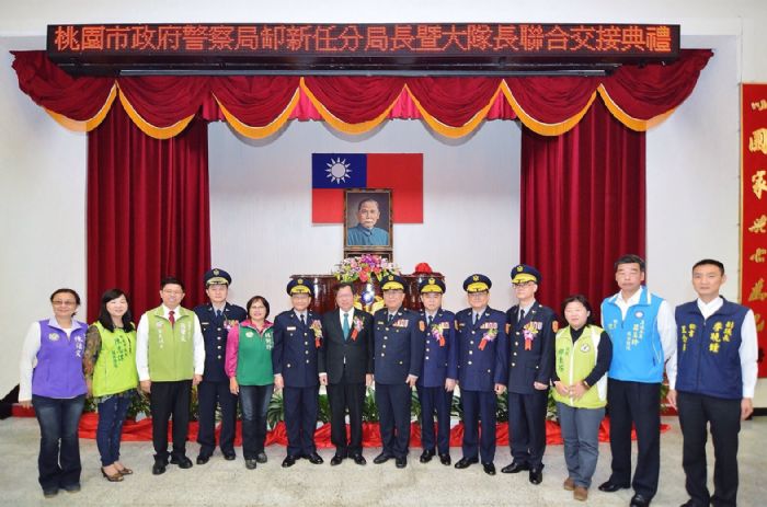 】桃園市長鄭文燦6日前往市警局大禮堂出席「桃園市政府警察局龜山、龍潭分局卸新任分局長暨保安警察大隊卸新任大隊長聯合交接典禮」,鄭市長表示,治安是城市發展的無形資產,良好的治安不僅可讓市民放心,也為桃園的整體發展打下堅實的基礎,期勉市警局團隊越來越好,共同打造桃園成為充滿年輕生命力與希望的城市。