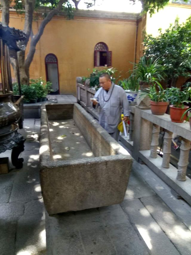 在福州開元寺考察了三口北宋石槽,其中兩口有紀年刻文的石槽放在著名的鐵佛殿前。台下一口石槽為北宋大觀二年紀年,刻文中還明顯地說“廚下結緣”,說明這口石槽原為廚房裡的貯水槽。