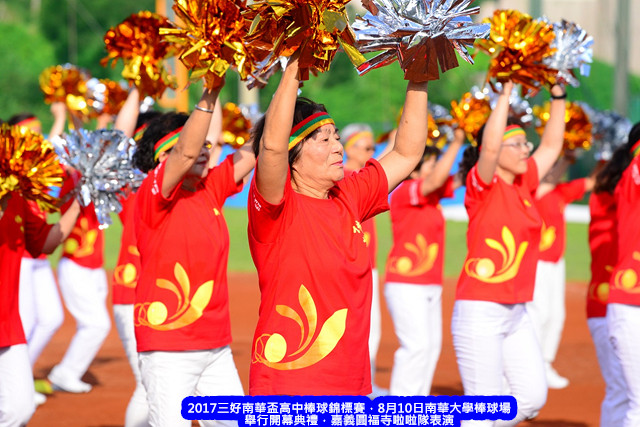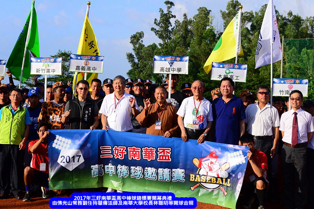 【記者于郁金/嘉義報導】由南華大學與三好體育協會聯合主辦「第1屆南華盃高中棒球邀請賽」8月10日下午假南華大學棒球場舉行,嘉義市圓福寺啦啦隊表演《給》、《三好歌》的輕快熱舞,為活動拉開序幕,隨即由普門中學棒球隊球員舉牌,引領高雄中學、嘉義高中、新竹高中、臺南一中等北中南16支棒球勁旅依序進場;在豔陽高照與掌聲不斷中,各個揮灑熱血青春的活力,野球魂燃到最高點。