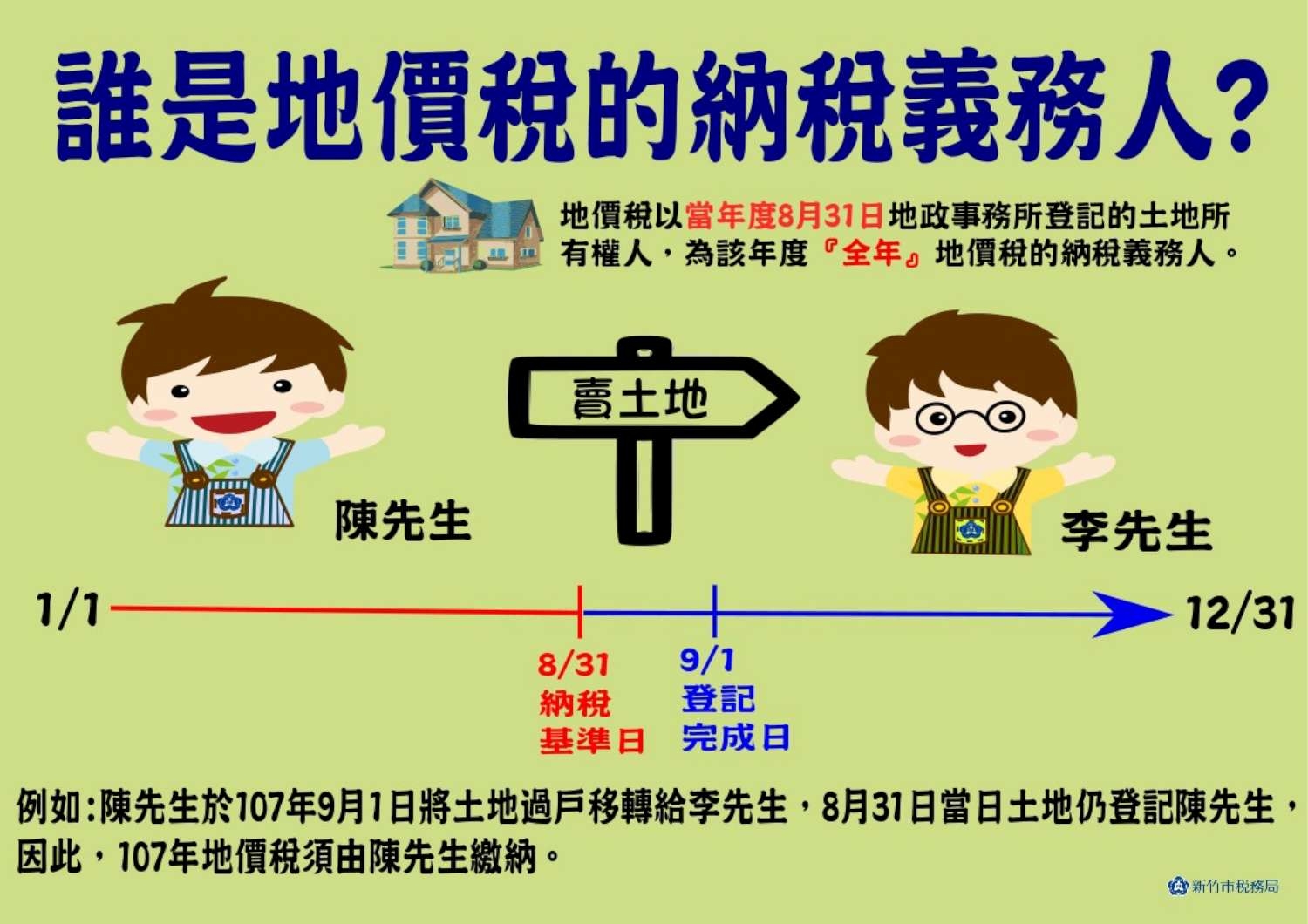 稅務局舉例說明,陳先生將土地賣給李先生,並於107年9 月1日完成登記,也就是說8月31日土地所有權人仍為陳先生,9月1日才登記為李先生,地價稅以當年度8月31日於地政事務所登記的土地所有權人為納稅義務人,所以107年的地價稅納稅義務人就是陳先生,107年地價稅應該要由陳先生繳囉!