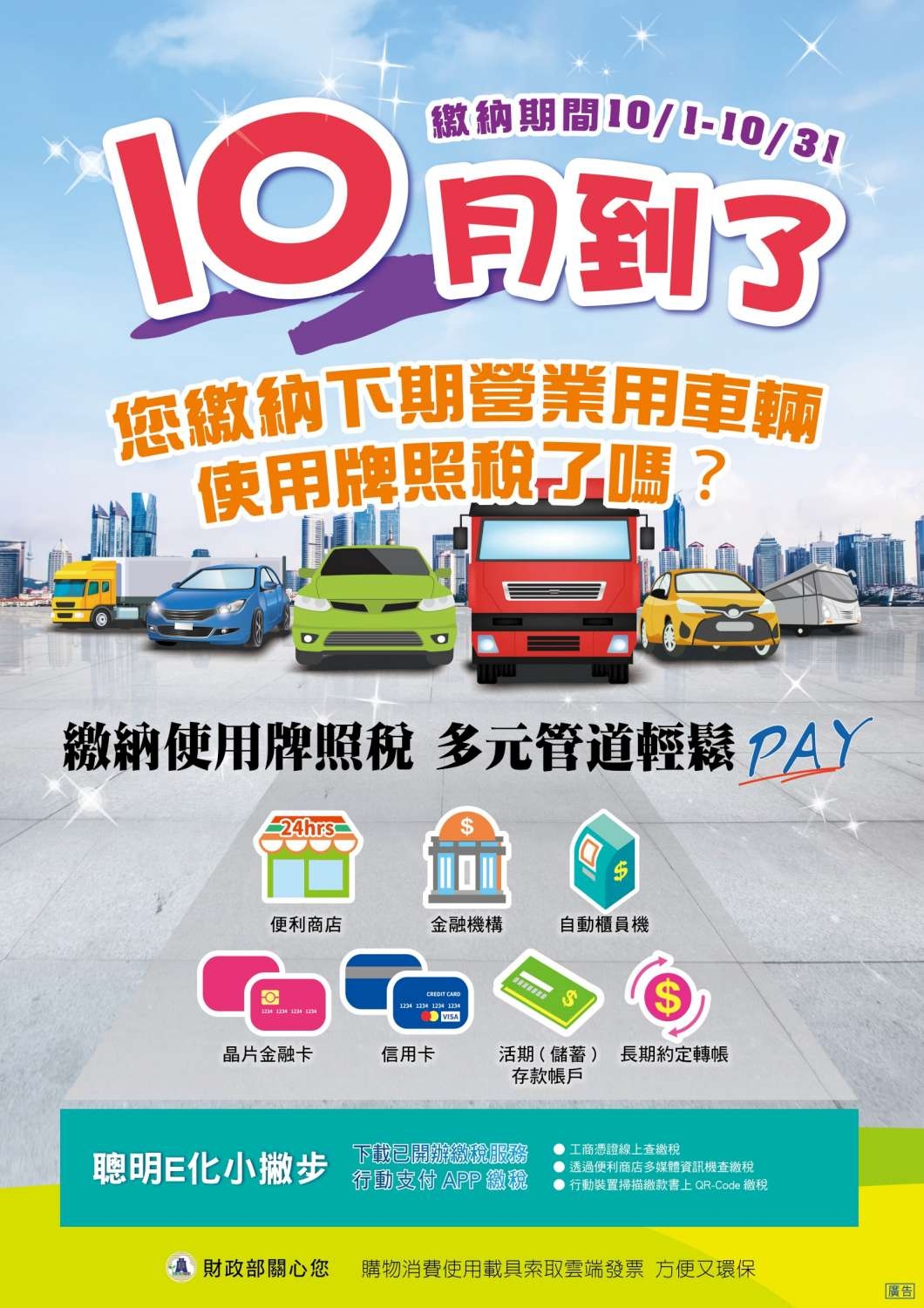 【本報訊】107年營業用車輛下期使用牌照稅自今(1)日起開徵了,繳納期間自10月1日起至10月31日,為便利納稅義務人繳納稅款,財政部提供ATM、網路、超商與行動支付等多元繳稅管道,市府稅務局也提醒民眾,多加利用便利繳稅方式,並在期限內繳納稅款,避免逾期加徵滯納金。