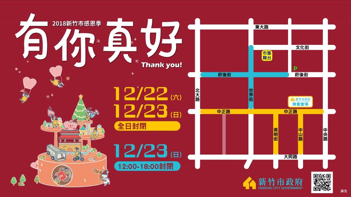(二) 107年12月23日(日)12:00-18:00,世界街(中正路─文化街)及府後街(北大路─仁愛街65巷)實施封閉管制。
