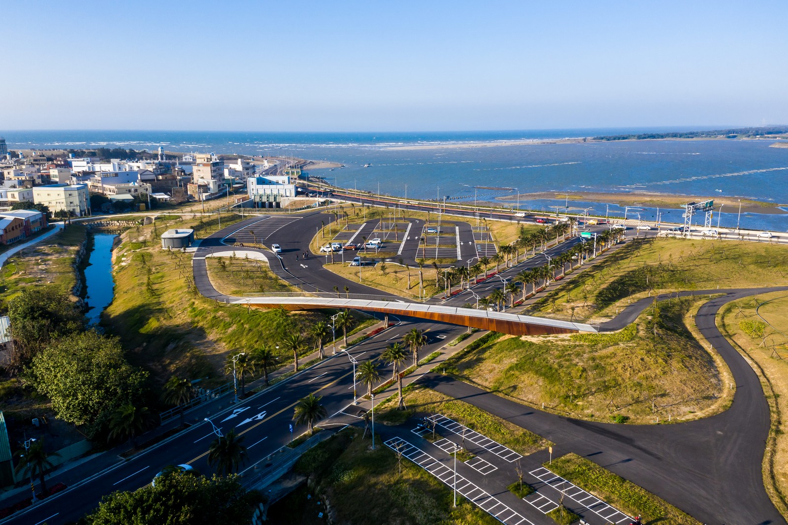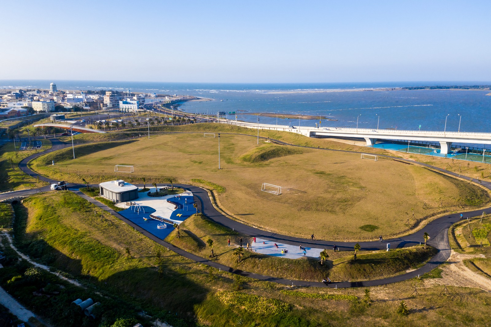 除了球場與原有讓毛小孩放電的狗狗公園外,現在還增加一大座草坪,過年期間,來這散步、放風箏或野餐,不用去遊樂園人擠人,在舒適開闊的左岸運動公園就可以共度美好的親子時光。除此之外,從左岸可以騎著自行車飽覽河岸風光,騎過出海口抵達南寮漁人碼頭品嘗尚青的海鮮,再散步到最夯的魚鱗天梯,與親朋好友留下美好的回憶。