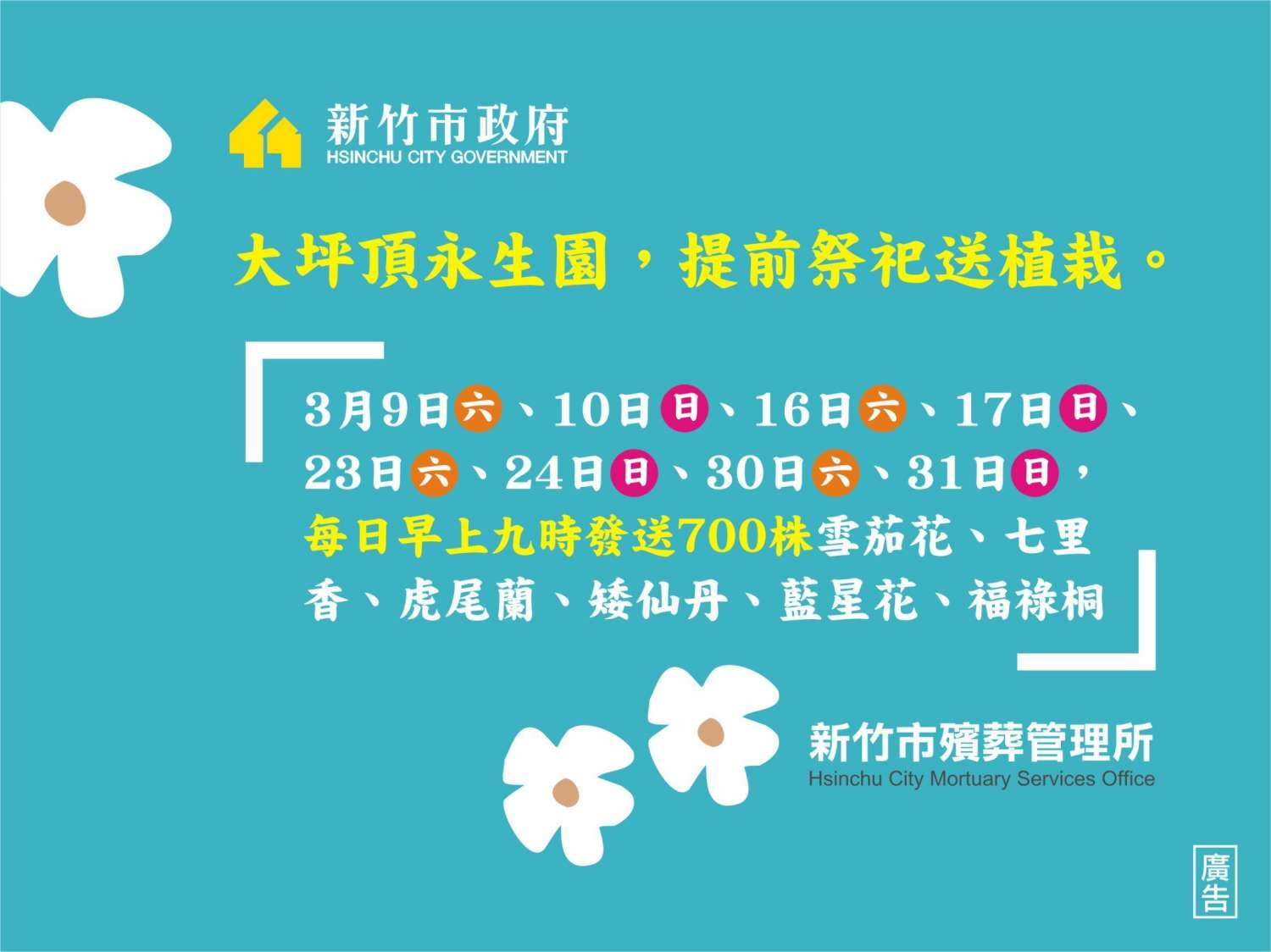另市府今年也延續辦理提早祭祀送植栽活動,民眾若於三月份的周六、日,3月9、10日,16、17日,23、24日及30、31日等8日提前至大坪頂祭祀,就有機會在現場領取免費小盆栽,每日上午九時發送盆栽700株,送完為止,歡迎民眾踴躍領取。