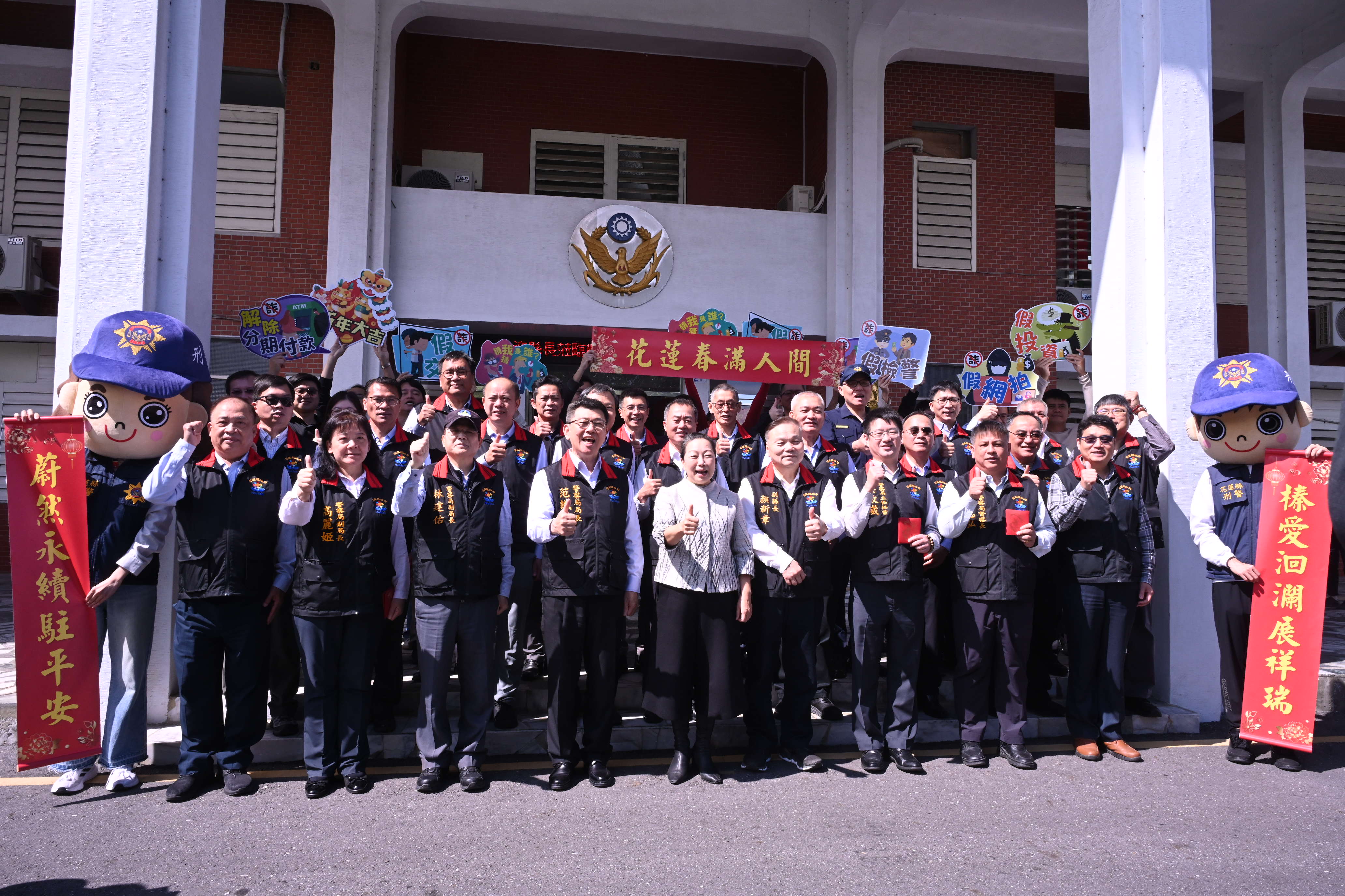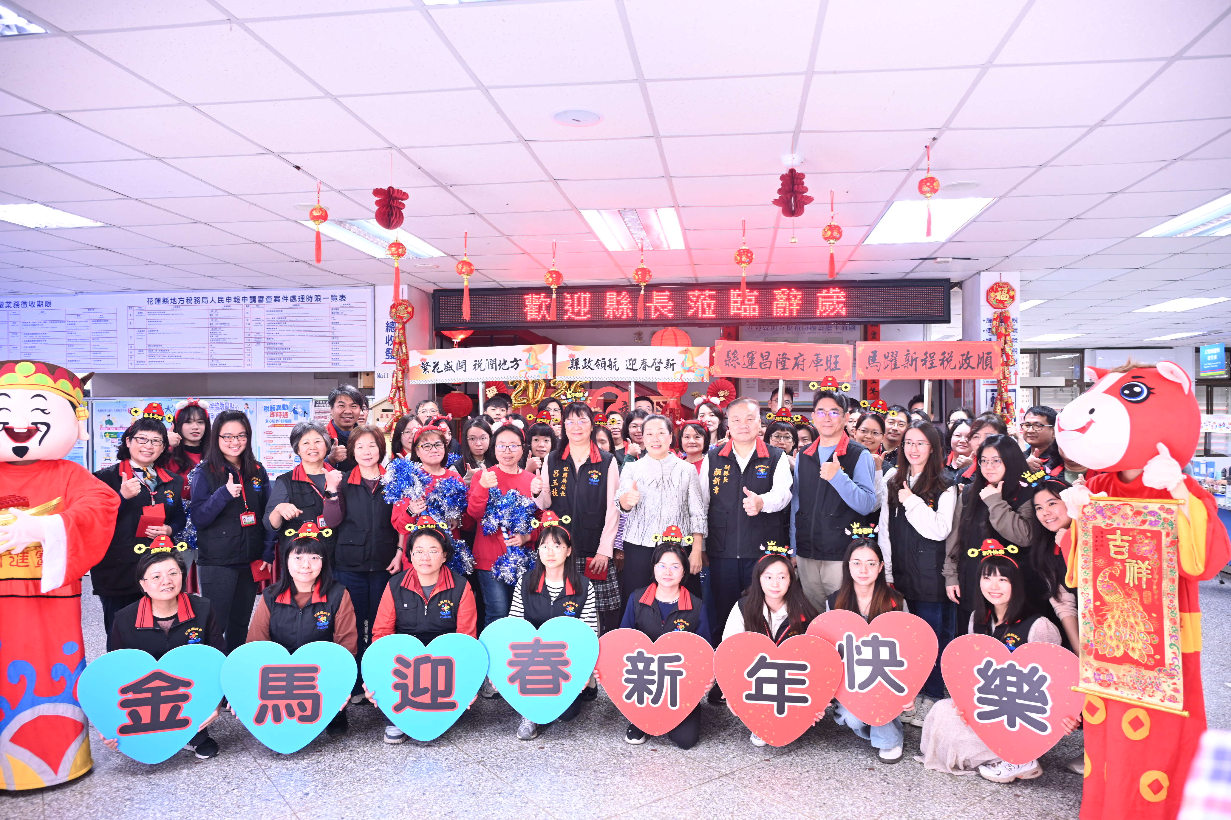 徐縣長前往縣府客家事務處、花蓮縣消防局、教育處、文化局、原住民行政處、環保局、警察局、地方稅務局及衛生局等單位辭歲迎新,下午則前往府內各處室拜早年。各單位同仁也發揮巧思,以溫馨熱鬧的方式迎接縣長到訪,現場洋溢年節喜氣與團隊活力,展現縣府團隊凝聚向心、攜手迎新的精神,為年終工作劃下圓滿句點。