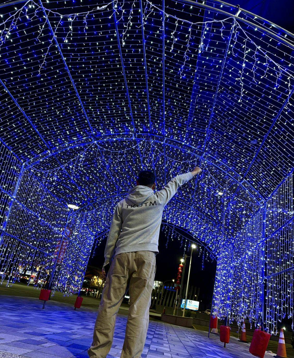 本次「馬年轉好運」氣勢磅礡,以宏偉紅色門樓為主視覺,搭配金馬奔騰意象,呈現「花蓮運讚」的祝福。門樓中央懸掛巨型金馬奔騰象徵運轉好運,為往來旅人點亮前行方向;一旁的「璀璨星光大道」以藍色燈海隧道象徵時間流動與旅途順暢,與金馬奔騰相互輝映。點燈儀式啟動後,熠熠生輝金馬與星光隧道燈海同步亮起,燈光交織映照整座轉運站,現場洋溢溫馨喜氣的年節氛圍。