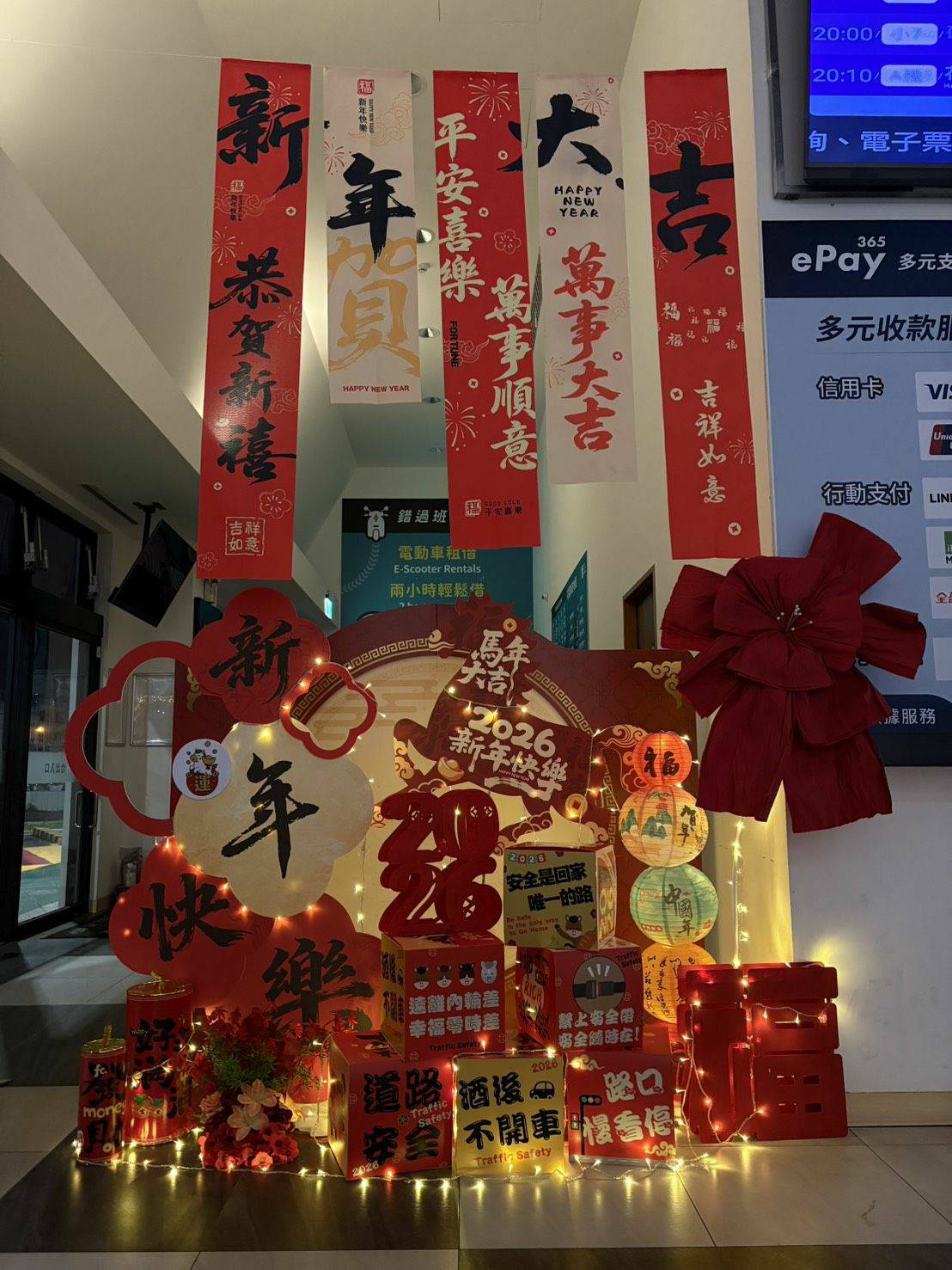 除了金馬奔騰與星光隧道外,轉運站內亦規劃多項特色燈區與互動裝置。「馬到成功.平安祈願牆」邀請市民及旅客親手掛上新春祈願卡,種下希望之樹,彼此祝福新年順遂;「馬上平安.道安互動區」則將道路安全標語巧妙融入年節布置之中,讓民眾在拍照打卡時自然傳遞交通安全觀念,兼顧節慶氛圍與宣導成效。此外,現場設置「平安回家・新春打卡點」,民眾拍照上傳至社群平台並標註「#馬上轉運 #平安回家」即可兌換精美新年小禮,溫馨提醒交通安全也增添互動樂趣。