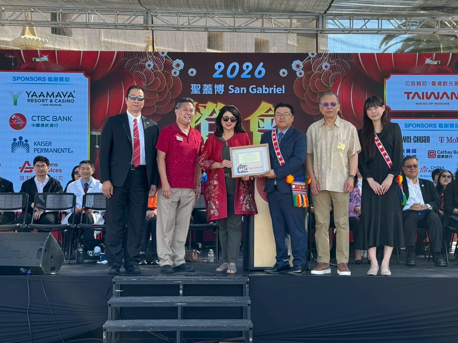 在聖蓋博市元宵節3月21日活動當天,聖蓋博市頒贈花蓮縣政府「SAN GABRIEL 2026 LANTERN FESTIVAL」感謝獎牌,本縣也回贈「透光石畫燈」,展現彼此友好之情誼,並進行點燈儀式。夜間花燈展示期間,由代表本縣的民政處同仁於現場發放115年花蓮馬年燈籠,燈籠採搖搖馬的設計讓提燈在提動時會前後晃動,祝福聖蓋博市民「搖出好運、馬到成功」,除此之外,並發放花蓮馬年開運福袋,其中福袋顏色是喜慶紅與金色相連,寓意著花蓮縣和聖蓋博市的緣分是緊密相連。期待兩地的友誼更加深厚,未來能有更密切的交流與合作。