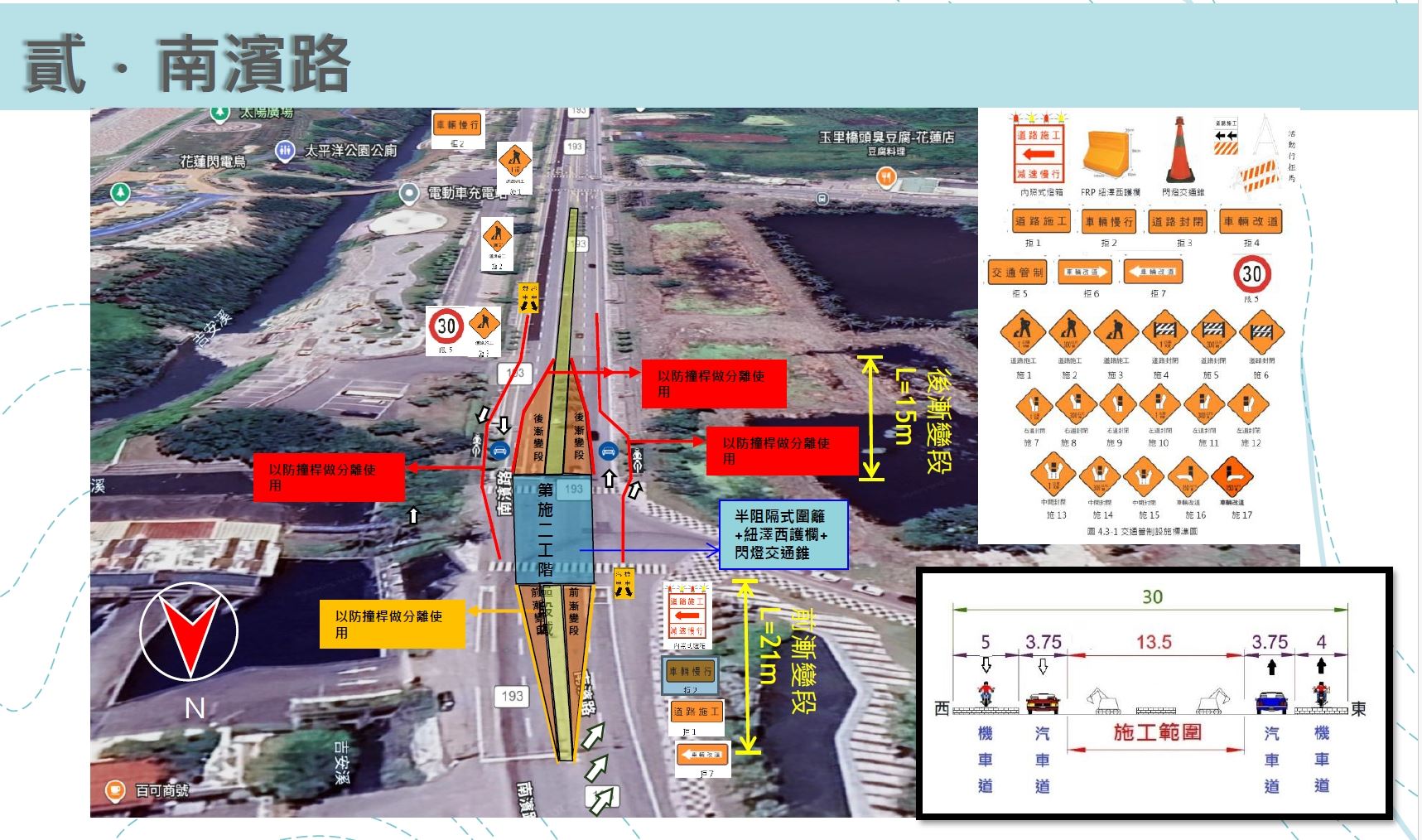 針對建設處下水道科所提「花蓮縣花蓮市南濱滯洪池新建暨整體景觀工程」,施工期間將對南濱路、明義街及和平路周邊道路採取交通維持措施。其中,南濱路車道將調撥至中央分隔島側,並設置防撞設施區隔汽機車通行空間,現場配置交通指揮人員協助引導車流。明義街部分路段將調整動線,並規劃替代道路銜接和平路。和平路則將配合工程占用部分人行道、停車格及機慢車道,施工期預計約3個月,實際期程將視現場作業情形調整,提醒民眾行經該區域時注意道路縮減及改道資訊。