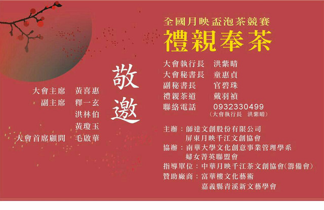 南華大學文創系主任張鐸瀚教授以「人寄草木洗塵心,草木中人最有情」祝福大會,並相信茶道禮儀、茶文化及生活美學之結合,共賞茶藝之美!屏東月映千江文創協會理事長曾瓊慧,她也是第3屆月映盃全國泡茶競賽大會總執行長,一向秉持熱心服務,不求回報,默默付出的精神與氣度,其功成不居的風範,引領著「月映盃」,一屆比一屆更出色,也帶動提升臺灣茶文化。