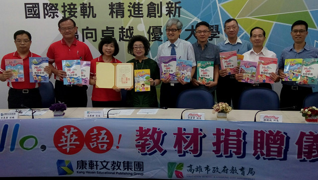 【記者于郁金/高雄報導】在國立高雄師範大學華語文教學研究所所長鍾鎮城促成下,康軒文教集團捐贈高雄市教育局《Hello,華語!》教材100套,於8月23日上午10時30分,假國立高雄師範大學行政大樓10樓國際會議廳舉行贈書儀式,由國立高雄師範大學校長吳連賞、高雄市教育局長范巽綠、康軒文教集團副總吳惠潔共同主持;高雄市教育局特別頒發感謝狀感謝康軒文教集團,對於新住民跨國銜轉學生華語教育之援助,期能達到抛磚引玉的作用,使高雄市華語教學能獲得更多民間資源挹注。