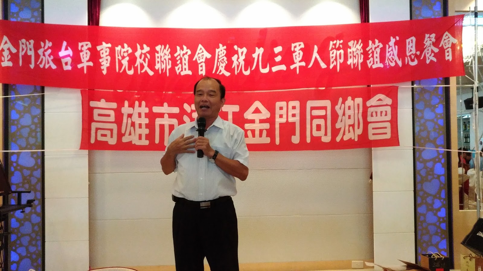 9月3日是一年一度的軍人節,為了聯繫黃埔情懷,凝聚革命情感,高雄市浯江金門同鄉會、金門同旅台軍事院校聯誼會當日上午11時30分,假高雄市鳳山區「鳳大餐廳」舉行聯誼活動暨感恩惜福餐會,來自四面八方英雄好漢,齊聚一堂,共同慶祝這個屬於自己日子「九三軍人節」;到場嘉賓包括陸、海、空、勤、警、衛,分別從臺南、高雄、屏東,甚至有遠從金門趕來;當日參與近60人,席開5桌,暢談軍旅甘苦及生活點滴;與會除了旅南區軍事院校軍、士官外,更有多位攜帶家眷熱情參與,共同分享這屬於自己歡欣時刻。