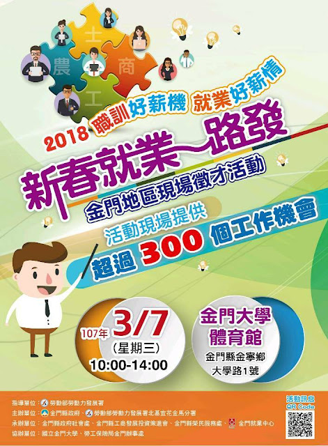 【記者于郁金/金門報導】期許給自己人生一個更好的舞台,為因應年後轉職及廠商求才需求,勞動部勞動力發展署北基宜花金馬分署金門就業中心結合應屆畢業生與屆退官兵,由金門縣政府、勞動部金門就業中心、金門縣工商發展投資策進會、金門縣榮民服務處共同舉辦「2018新春就業一路發」金門地區現場徵才活動,將於107年3月7日(星期三)上午10時至下午14時於金門大學體育館(金門縣金寧鄉大學路1號)舉辦「2018新春就業一路發」金門地區現場徵才活動,現場將提供超過300個工作機會,歡迎欲求職、轉職民眾踴躍參加。