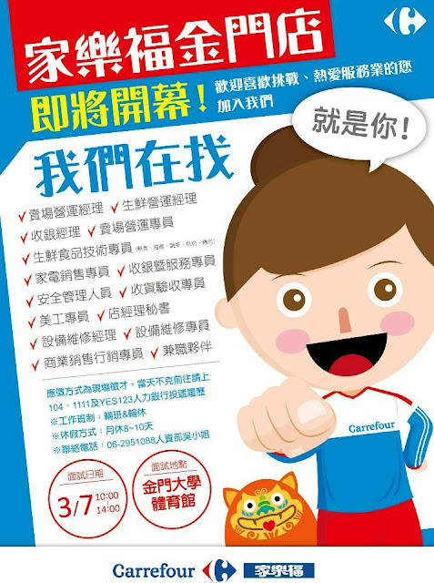 勞動部勞動力發展署北基宜花金馬分署金門就業中心表示,此次參加廠商有家樂福、遠東航空、麥當勞、摩斯漢堡、昇恆昌免稅商店、金湖大飯店、風獅爺購物中心、囍莊企業、綺麗珊瑚、聖祖食品、良金牧場、六合餐飲、八分舖茶館、宸榮科技、豪福節能科技、陸島酒店、海豐餐廳、天根草典、盧冠宇牙醫、沐康岩盤浴會館、新光人壽、兆順企業社,以及及代收履歷廠商,包括友達光電、桃禧航空城酒店等各大優質廠商,提供超過300個工作機會,歡迎求職民眾踴躍參與,掌握就業良機,洽詢電話082-311119,金門就業中心(當日徵才活動如有變更,以現場公告為主)。