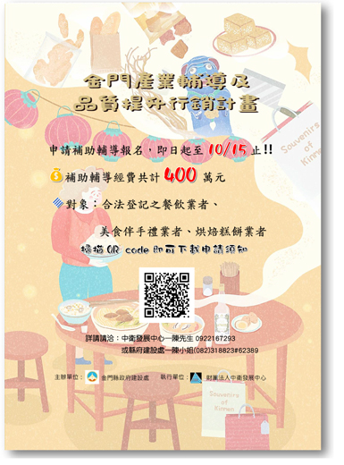 縣府建設處表示,申請相關文件及詳細內容可至「金門美食讚」FB臉書或縣府建設處FB臉書瞭解詳情,或至金門縣政府建設處下載(下載路徑:便民服務—民眾申辦案件表格—工商科—「金門產業輔導及品質提升行銷計畫」申請須知),郵寄地址:台北市中正區杭州南路一段15-1號3樓(封面請註明:財團法人中衛發展中心 金門老店經營輔導及實質輔導單位收),或送至建設處工商科3F陳小姐。